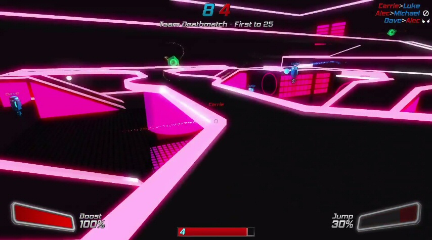 The arenas offer plenty of different layouts ranging from simple open areas to complex tiered levels, scattered power-ups, ramps and jump pads, and the lights always glow with the rhythm of the music.