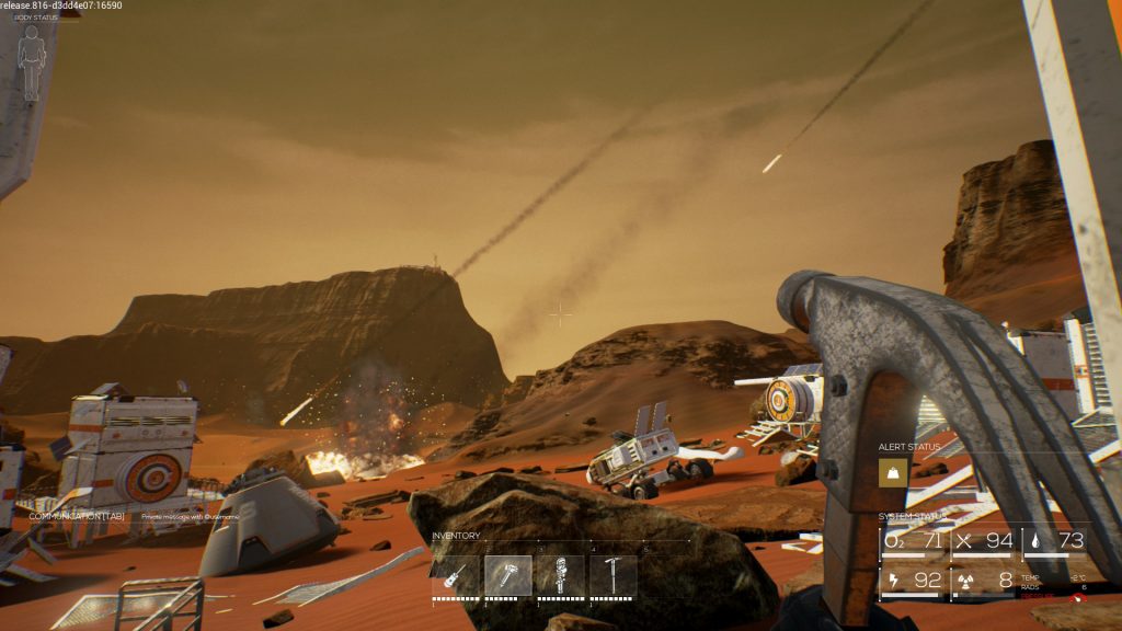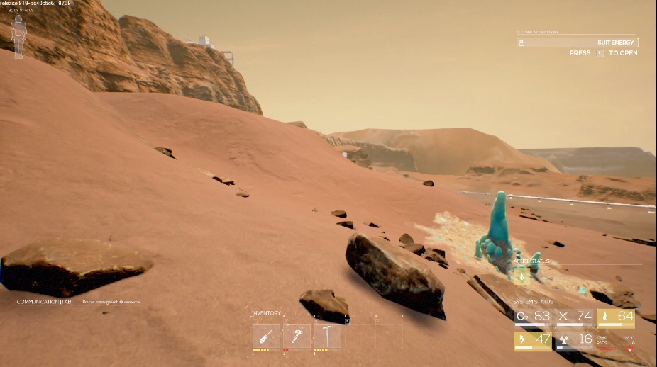 After landing on Mars, your task is to find out what happened to the previous colonies and the people that were sent down to attempt to terraform the planet. While exploring to find clues, you will have to keep a close eye on your basic needs: food, water and oxygen. Your suit’s HUD will show you how low you are and you will also receive alerts for when your meters start to go down.