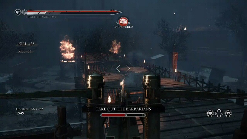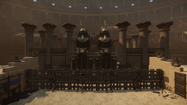 Beacon has you infiltrating enemy territory at night. You must free the prisoners first, then hold your ground and defeat barbarians while you light up a beacon in order to call for reinforcements. Reinforcements do come, and with them you’ll need to dodge the projectiles while dispatching the final horde. Not to sound like a home and garden show, but I really like the landscape, greenery and waterfalls in this map. It’s also interesting to turn around and see part of it change into Roman buildings and statues, and see the soldiers gathering on the other side. Beacon is a challenging map because of its night time setting, since you can barely see anything in certain spots. Next time I’ll put on the Commodus skin for contrast purposes, since while using Damocles I can’t even see where I am in the shadows.
