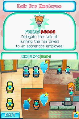 A blue bubble above the customer’s head indicates their desire to have their hair washed, while a yellow thought bubble corresponds to hair styling (whether basic styling, perms, or even hair dying), a green bubble for eyelash plucking or spray tanning, purple for manicures and so on. While some categories of customers, like elderly gentlemen, are very low-maintenance, requiring a simple haircut before heading to the cash register, others like businesswomen or brides desire much more, causing you to focus a substantial amount of your time on satisfying their every whim.