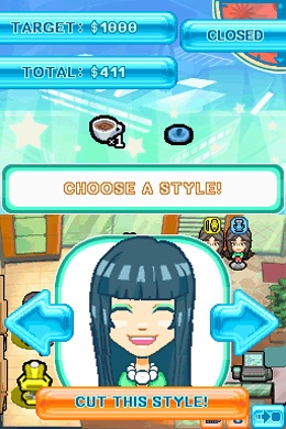 Whereas in games like Cake Mania or Diner Dash one tap of the stylus takes care of a particular task, and allows you to simply wait for it to be completed before moving on, Sally’s Salon instead requires more direct player interaction. For instance, instead of simply telling Sally to cut someone’s hair, you instead are required to scroll through a slideshow-like feature containing various styling options, until you find the perfect hairstyle for each particular customer. A customer’s satisfaction with each hairstyle is indicated by their facial expression, with frowns obviously indicating disapproval and vice versa.
