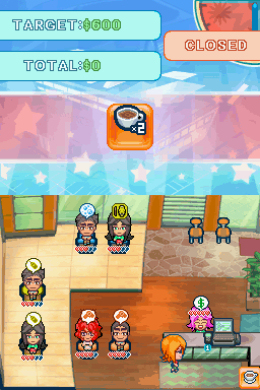 Gameplay is very similar to any other time management sim, with one noteworthy variation on the system. Retained from similar games is the drag-and-drop gameplay that tasks you with controlling Sally’s every movement, by dragging a customer (via use of the stylus/touch screen) from the waiting area to their area of choice.