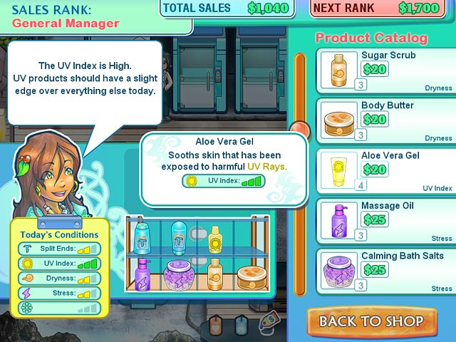 Another layer to the game is the spa products counter, which Sally’s friend Nell is helping run. Depending on the conditions of the day, particular products will be more in demand. You stock your counter with products most in demand, and your customers that are waiting in the waiting chairs will walk over and pick up some products to purchase upon checkout, as long as they stay happy of course. Each sale will add up to your money total, so it’s important to stock the most appropriate products!