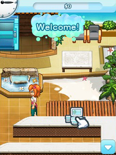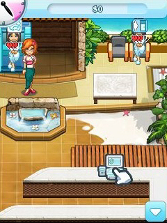 You use your finger to hold and drag customers to their respective stations. Some require just a tap to turn on the sauna or tub. Others open up a screen that has you making a choice of what type of that particular service to perform – such as what kind of bath fizzy or facial mask to use. The customer’s facial expression will determine which will give the customer more hearts in their heart meters. After each service is performed, the customer will either have another bubble over their heads requesting a new service, or they will go to the checkout counter to check out. Customers also come in all varieties, ranging in patience and how much they tip. Some also only come in pairs so you have to place them sitting next to each other.