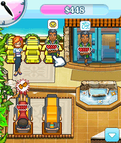 The spa consists of 4 (and eventually 5) spa service stations: sauna, facial, massage, whirlpool, and manicure/pedicures. Customers enter and sit in the waiting area, a bubble over their heads indicating the station from which they request services. They also have heart meters that show how happy they are. If they run out of hearts, they run out of the spa, so make sure you keep them happy!