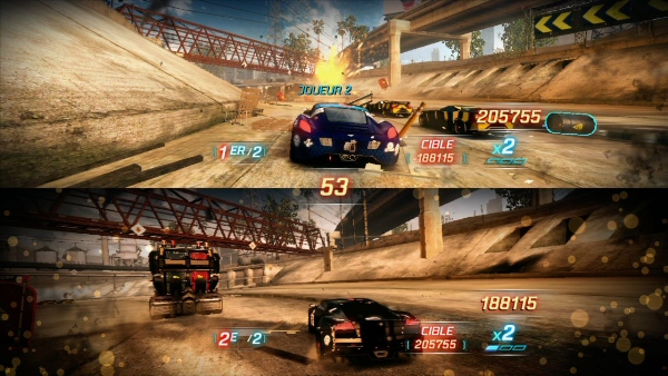 The higher the level of your Power Play, the more impressive the scene will be. For example, activating a level 1 Power Play may cause a crane to come falling down or lower a raised bridge, while a level 2 will collapse a good portion of the track. Dodging a crashing plane, outrunning a crumbling building, steering away from a ship crashing into the dock, driving blind through clouds of falling debris from exploding structures, these stunts aren’t short of impressive.