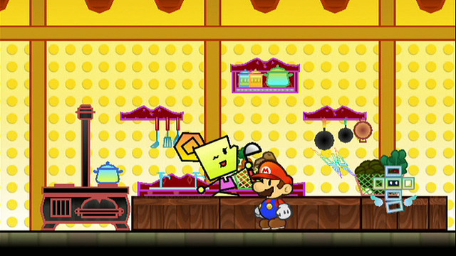 Most of Super Paper Mario is conventional 2D platform gameplay. However, early in the story Mario finds someone who teaches him how to flip into 3D. Flipping into 3D turns those flat-looking levels into something very cool, showing you secrets that you couldn’t see before in 2D: hidden paths, platforms, coins, blocks, sometimes even certain key characters. It helps you progress through what initially may seem like impossible obstacles. However, there is a time limit to be in 3D mode. The meter gradually decreases as you walk around, and if it empties, Mario will lose HP.
