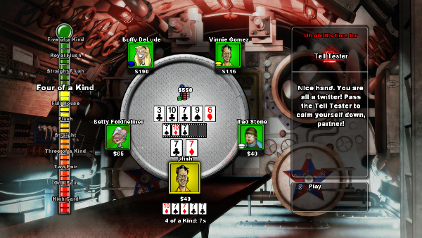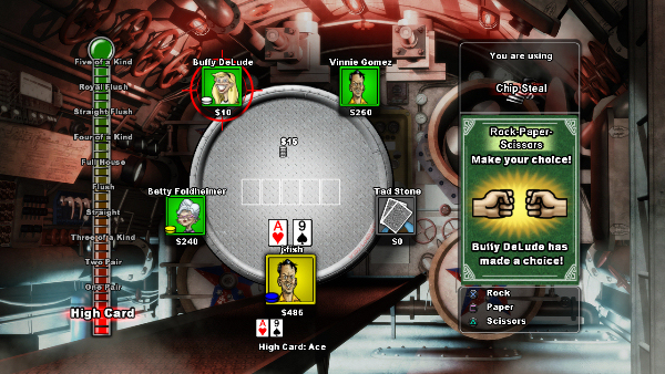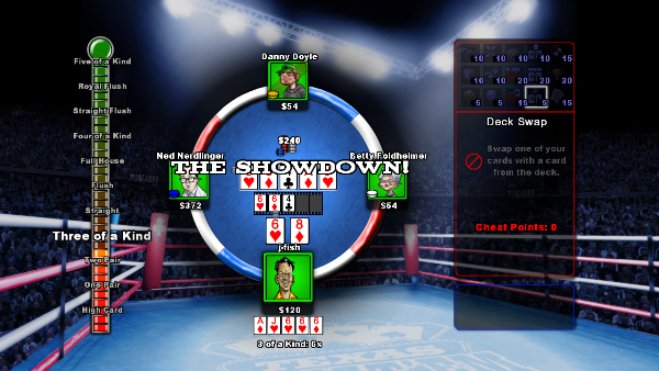 Cheats come in various forms, and each cost a different amount of Cheat Points to pull off. At the beginning of each round of betting your cheat points are renewed and you can choose from cheats that allow you to change the value of one of your hole cards or one of the community cards, change the value of an opponent’s hole card, lock in the cards in the community (so that other players can’t change the card values), and even steal chips from another player.