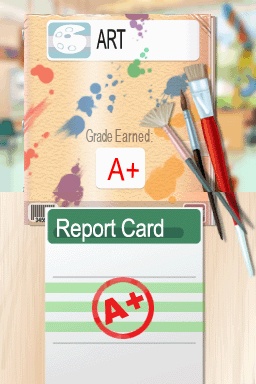 The game is mostly an adventure. Tap here and there to move between different areas (tap once to walk, double tap to run, triple tap to instantly go there), tap particular dialog options to talk to people or interact with objects. But there are a series of mini-games in between the roaming around. For example, the classroom lessons are “learned” by playing a specific mini-game to that subject. Your schedule (which you build in your first day of school and then again at the start of each week) is composed of two classes per day, and you can pick any combination out of the five subjects: art, geometry, chemistry, gym and home economics. They’re not particularly difficult nor interesting, but each offers a practice mode and three levels of difficulty (6th, 7th and 8th grade).