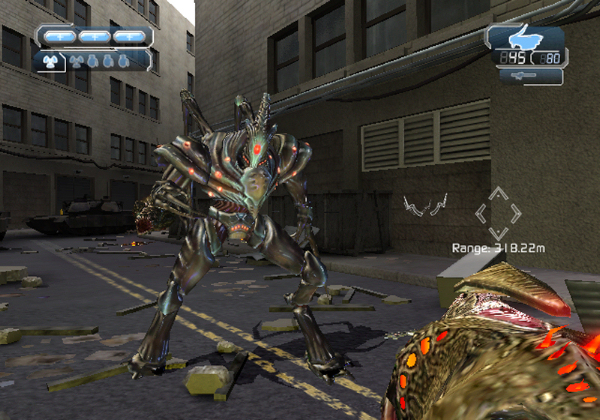 The same nondescript bookshelves, tattered draperies, and knocked about furniture populate the majority of every above-ground environment you’ll play through, while underground sewers have the same linear “finish one room before moving onto the next” pattern, allowing for virtually no in-depth environmental exploration, other than standing around listening to police chatter on radios in each level. The foreground details, however, are of a fairly high quality for a Wii game, especially when discussing the various species of aliens or large variety of weapons Ford has at his disposal.