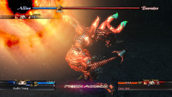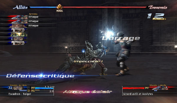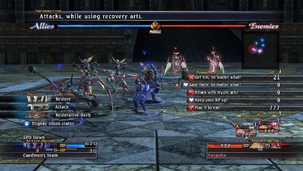 As I said, the battles are massive. You don’t exactly control a party, but a whole army. Your army is split into squads (here called unions), each composed of five members (units). Each unit has its own equipment, stats and arts (the game’s versions of spells and combat skills). You can arrange their formation, choose the type of attack for the union (and not for each unit as in any other RPG) and then watch them perform their commands. Then the enemy army does their turn, wash, rinse, repeat. The first few battles will throw all kinds of tutorials and plenty of text at you, so learning all these names and commands may seem like a lot to take in in a short time, but after some practice it’s not so bad.