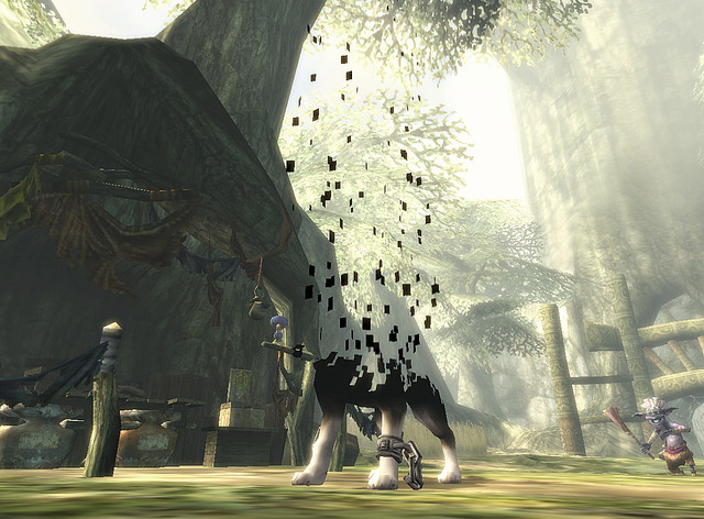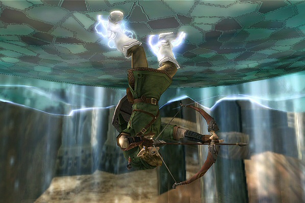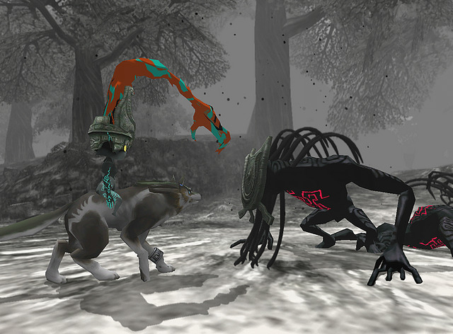 Now, the whole premise of Twilight Princess is that there is a world stuck in between light and darkness. This is the Twilight Realm, and it’s here that Link assumes the form of a wolf. I have to say, Wolf Link isn’t as fun to play as “regular” Link. You get a little mysterious helper named Midna, who gives you hints (you can hear the giggles coming out of the remote if she has something to tell you) and a helping hand when you need to jump to apparently unreachable places. It’s very clear that she’s not helping because she’s nice, she wants something from you.