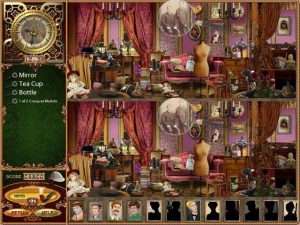 The basic gameplay for solving a case is composed of a mix of several activities, starting by spotting the differences within a time limit. Here, you are given before and after photos, and your job is to find what is missing, what was added, and what was moved. The little magnifying glasses on the left will indicate how many you still need to find. You can use the magnifying glass to zoom in on something. A few extra items – Sherlock Holmes’ hat and pipe – are usually hidden in the scene. The pipe gives you an extra hint, and the hats will unlock the Laboratory game. Clicking on wrong places several times will deduct time from the clock, while finding several differences quickly will give you a speedy bonus.