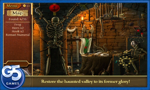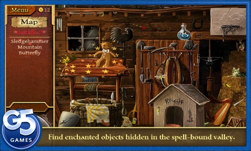 Now… The Magician’s Handbook: Cursed Valley could have actually been a better game if the frustration factor was turned down a notch. Yes, object-finding games are supposed to be challenging but trying to find objects on the list that aren’t even spelled correctly is another challenge on its own! I roamed around a particular scene looking for a “cantelope” (how do you pronounce that anyway, kan-tell-oh-pee?), which I wasn’t sure if they meant the melon-like fruit or something else. I even used a dictionary to see if this was some word unknown to me. Eventually, and through repetitive erratic tapping, I discovered that this “cantelope” was one of the brownish pumpkin-like oval things… Ok, so I type like crap frequently too, especially when tired, but at least I have the common sense to use a spellchecker when I write something for publication! To discover “typos” on a game that’s already been released on PC, Mac and two other mobile platforms (iOS, Kindle) is just sad – not to mention disorienting. Having to guess what certain objects on the list actually are instead of WHERE they are is not fun.