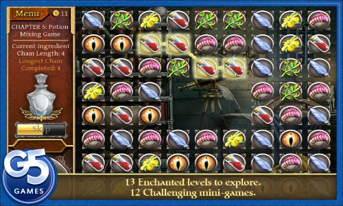 To make your potion and spell you must find ingredient chains on a puzzle field. Tap and drag with your finger across the same icon, as long as they are adjacent pieces on the board. The longer the chains, the quicker you fill the potion. The spells you acquire will then be helpful on the object finding scenes to temporarily get rid of distractions that crowd the screen and hinder your ability to find things.