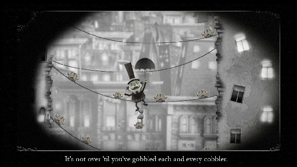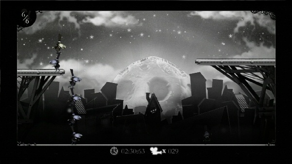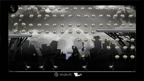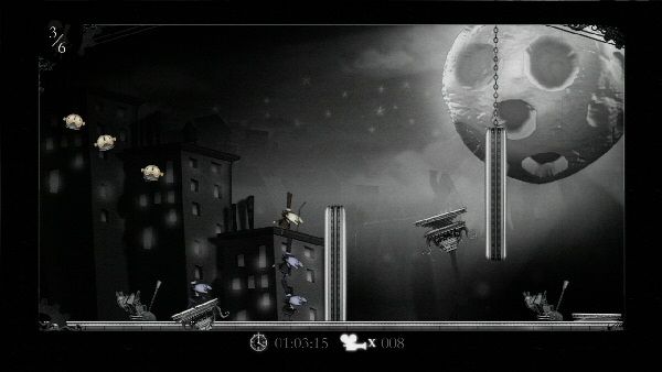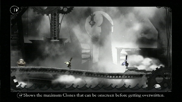 Throughout it all, you’ll be presented with a terrific art style. The game is primarily black and white, the pies standing out from the monochrome color scheme as a shade of peach, with the graphics containing a real feeling of depth (regardless of the game’s side presentation) due to the layers of buildings, lampposts and other environmental phenomena that constitute the backgrounds. One especially nice element to the presentation comes in the form of the film-grain overlay that plays as you are recording your clones; it’s one of many small details (like the clever naming of levels based on twists of novels or popular culture) that, in addition to the game’s catchy instrumental soundtrack, really helps flesh out the experience.