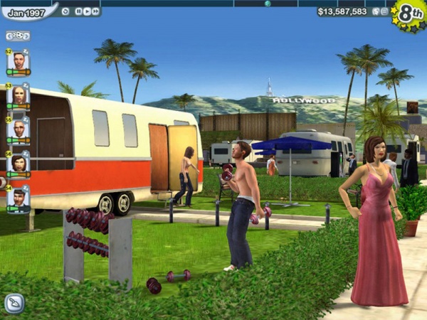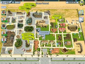 The basics of the game start with lot planning and building. Only a few buildings will be available at first, so arrange them in a way that leaves you room for other things. Planning ahead adds to your lot’s popularity, so make sure everything is connected by paths (but don’t make large paved areas), place enough restrooms and snack vans, add some landscaping objects and make sure there are a few things your stars can be entertained with. Hire enough janitors to keep your grass green and your litter in the bins and enough builders to build and repair your facilities.