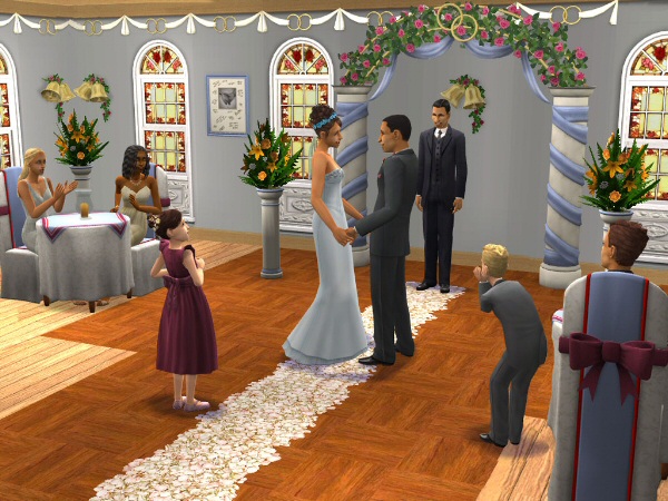 As far as the new skins, you will only be getting new formal styles for the whole family in this Stuff pack, no new casual clothing. The new tuxedos for men come with a little rose on the lapel and in five different colors, while the women get a few more dress options. There are five new dress styles for the ladies, one for teens and two for little girls, so you can have brides, bridesmaids and flower girls dressed appropriately for the occasion. But although the dress meshes (the shapes) are interesting, the textures don’t really make them justice, and I’m already planning to make my own. There are a few new hairstyles for the ladies as well, some up-dos with flowers, veils and a tiara.