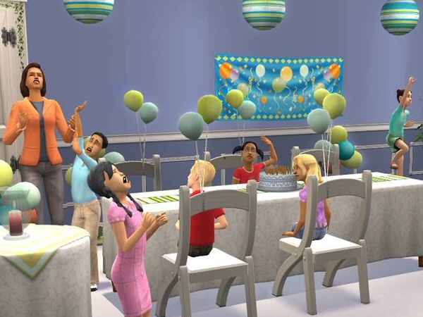 Let’s start with the new objects. No party is complete without a buffet table, so a new one is included with some festive and colorful cover options, plus matching small round tables and a long three-tiled table. There are four new chair designs: folding chairs with a balloon decoration or a little flower bouquet, a pseudo-throne chair and banquet hall style covered chairs. There is also a festive bar, outdoor umbrellas and ceiling lanterns to match the table patterns. Of course, there are balloons, banners, floral arrangements, floral archways, balloon archways, birthday cakes and wedding cakes to help set the whole thing up.