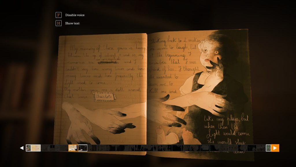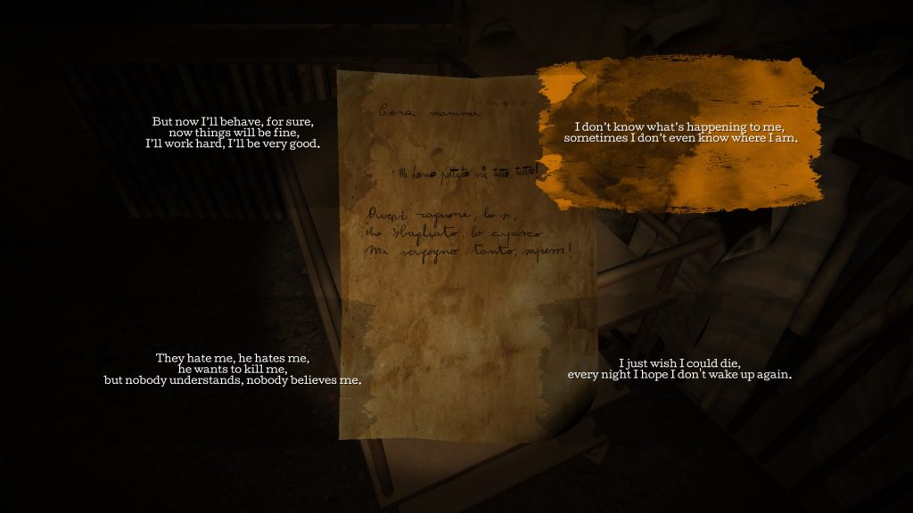 The scavenged documents are all hand-written in Italian, and there are a plenty of them to find. There are also old photos, audio records and some video footage which help add to the story. Everything is narrated, including Renee’s diary pages, through great voice acting. And as one would expect from a story-driven experience, the music and sound are fantastic.