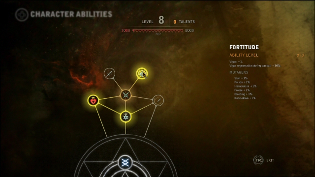 I absolutely love the skill tree. It was intimidating at first, but I grew accustomed to it. It’s like building your own little DNA strand and customizing it to your liking, choosing skills from the four different paths: Witcher, Alchemy, Magic and Swordsmanship. But then there are little bonuses on certain skills, which let you mutate. These will have a little extra slot where you can place a mutagen, and since I never read the manual, I found out by levelling up and unlocking a skill that could use one.