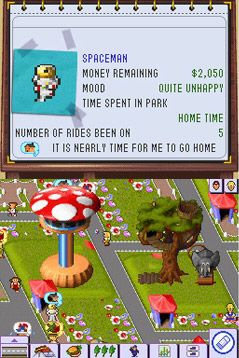 Staff is very important too. You need handymen to clean you the guests’ mess, security guards to keep an eye on vandalism, and entertainers to keep people from being bored in line. You can give your staff a little tap with the stylus as a form of encouragement too. It may not seem much, but they will work harder. You can also set their “patrolling areas” to keep them from wandering all over. Sometimes they will call you to a meeting to enter negotiations for a raise, it’s up to you to meet them halfway and get the best deal out of it, otherwise you have a strike on your hands, which in turn means broken rides and dirty paths.