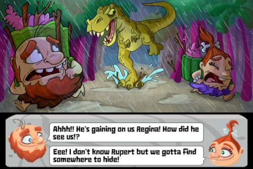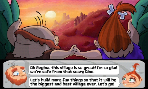 Tiny Village starts you off with two cave people running from a dinosaur, eventually stumbling across a strange rock. The power of this rock seems to scare the dinosaur away, and so our couple decides to start a settlement in the vicinity.