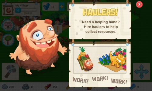 As far as resources go, you have food, rocks and wood to start with, eventually “discovering” lumber, fur and wovenfur (cloth). The total for each resource is conveniently shown at the bottom of the screen. You will need to build facilities to harvest the resources: quarry, farm, tree chopper, animal pen, lumber mill, weaver. There are different types of each facility, and each offers different bonuses to the resource obtained. Facilities require workers, so you must assign a villager to work there so production can begin. A harvesting facility can only house so much of a given resource, so your choices are to collect them manually or to have another worker do the hauler’s job, and moving the stock to the storage. “And how do I get workers?”, you may ask. By building houses. Jobless cave people will stand outside their homes, and you can assign them to a job. If you don’t have enough homes to staff every position available, you can hire a worker for 8 hours.