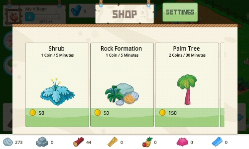 To purchase these much needed and useful facilities you need income, which is primarily earned by opening trade stores. Stores will use the different resources to create items, which will sell for a wide range of prices and give you more experience, depending on how long it took to produce. You can also earn income by collecting it from houses and decorations around the village. Each item will produce a little bit after a specific amount of time has passed.