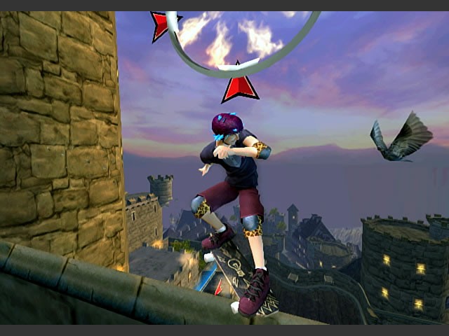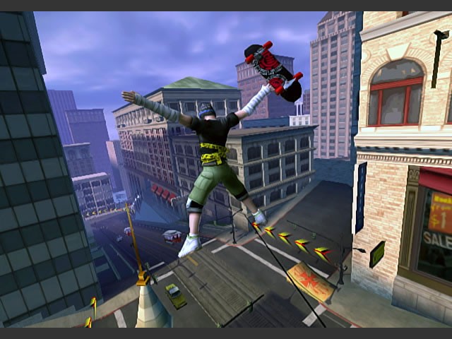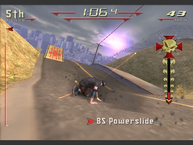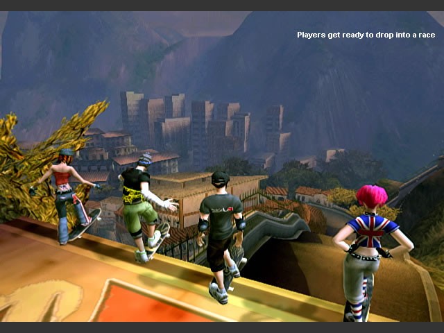 First of, Downhill Jam is basically any snowboarding game you know, without the snow and on a skateboard. It’s composed of a series of races instead of mission-based gameplay. You’re always launched off a ramp and away you go, downhill, facing your oponents, pedestrians and all sorts of urban obstacles.