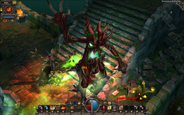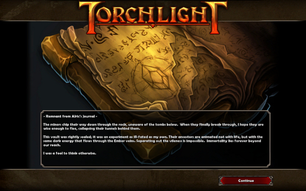 Once you have your character and your pet (and this takes only a few clicks), you’re ready to go. With a simple story relating to how the magic mineral Ember can corrupt the citizens of Torchlight, the game sends you off into the monster-packed underground caves.