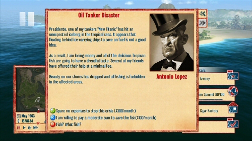 You must also cater to your foreign relations by sending money grants when they need help, siding with a particular country on a certain matter, allowing (or not) another country to exploit your resources, export more goods to some place or another. A good thing about foreign relations is how they help you out when disaster strikes. A tsunami, earthquake or volcanic eruption destroyed some of your buildings? Here’s $10,000 to help you rebuild, courtesy of the U.S.S.R. And heck, maybe it’s my luck, but I was always being shaken up by earthquakes followed by tsunamis, so I was grateful for that. Not only I could rebuild what was destroyed, but there would be enough money left for some bonus building!
