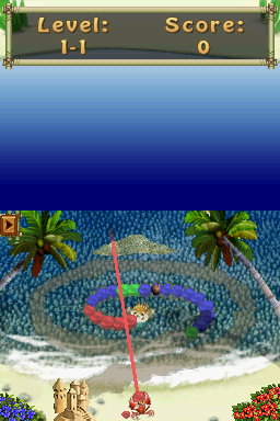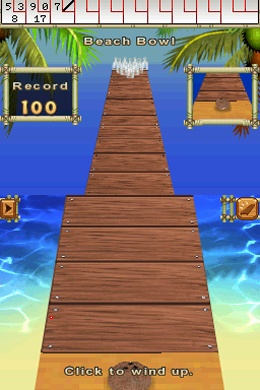 This unnecessary and even a bit frustrating unlocking system aside, Tropix’s eleven games are spread throughout a variety of genres. Coco Bowl, for instance, is (as the name suggests) a bowling game that has you sending your coconut bowling ball down the lane to a group of empty bottles via a flinging motion of the stylus on the touch screen, while Parasail has you controlling a parasailing monkey in side-scrolling levels by dragging you stylus in the direction you wish for him to move.