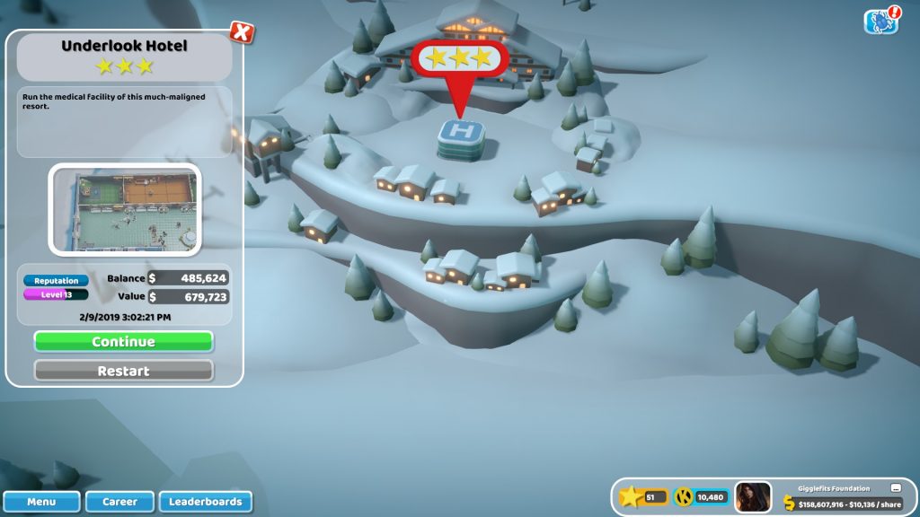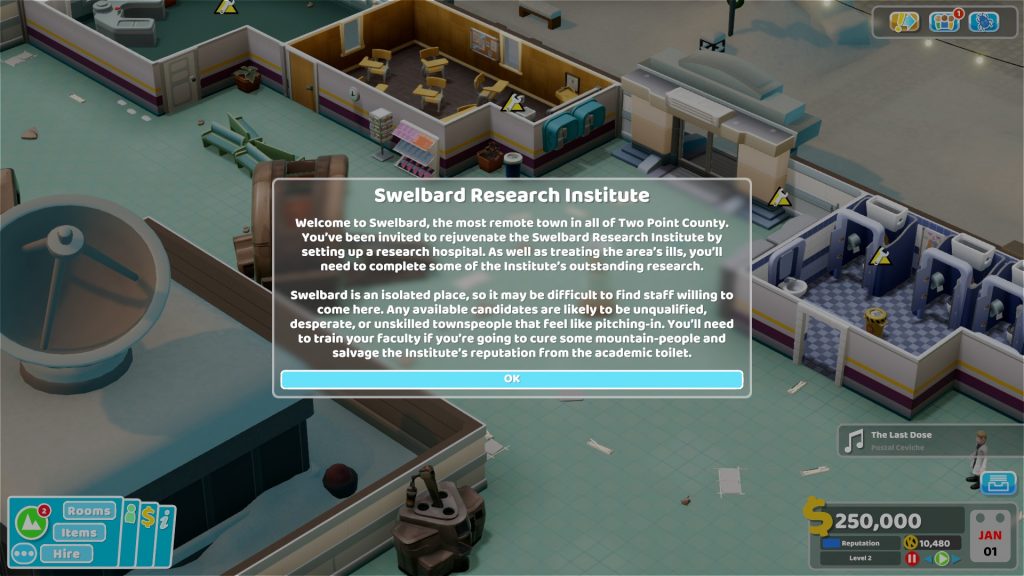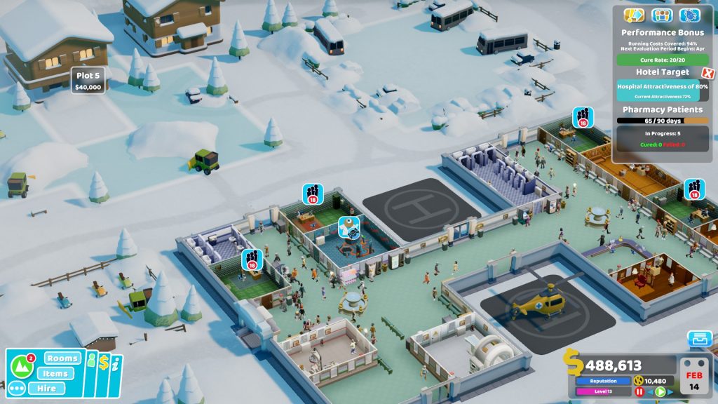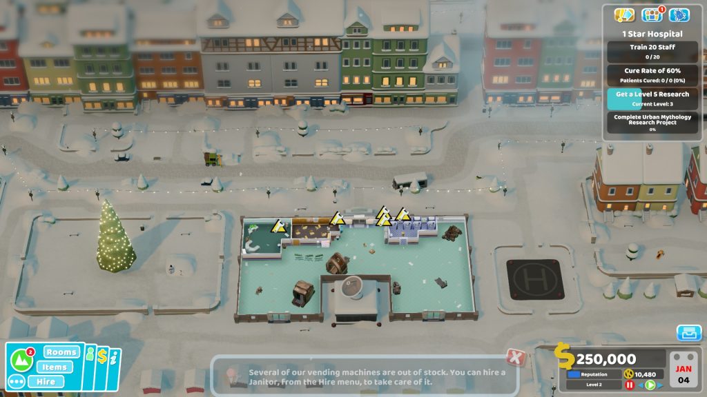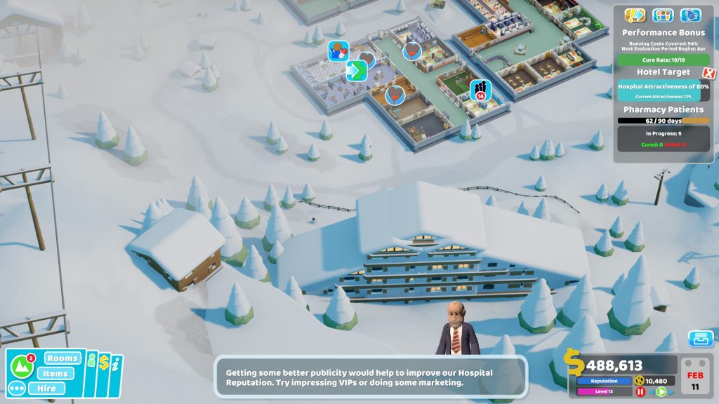 Travel to the Underlook Hotel (a little Shining humor), Swelbard or Roquefort Castle and try your best to keep your finances afloat, as you won’t be earning any income from cures, diagnosis or vending machines. The only way to get some cash is by completing goals, so save your bucks and don’t build everything right away, because soon enough you will need to complete a particular goal and have no money to do so. I found myself stuck several times restarting because of a few particular goals: train or promote staff, launch marketing campaigns, increase room level… all of which cost money! Start slow and take it easy. These hospitals will be time-consuming and completing them successfully will require you to put in practice everything you’ve learned about managing a hospital in previous stages.