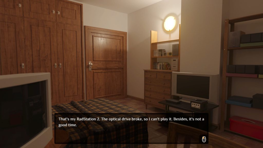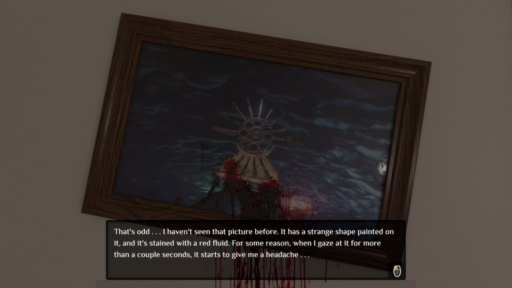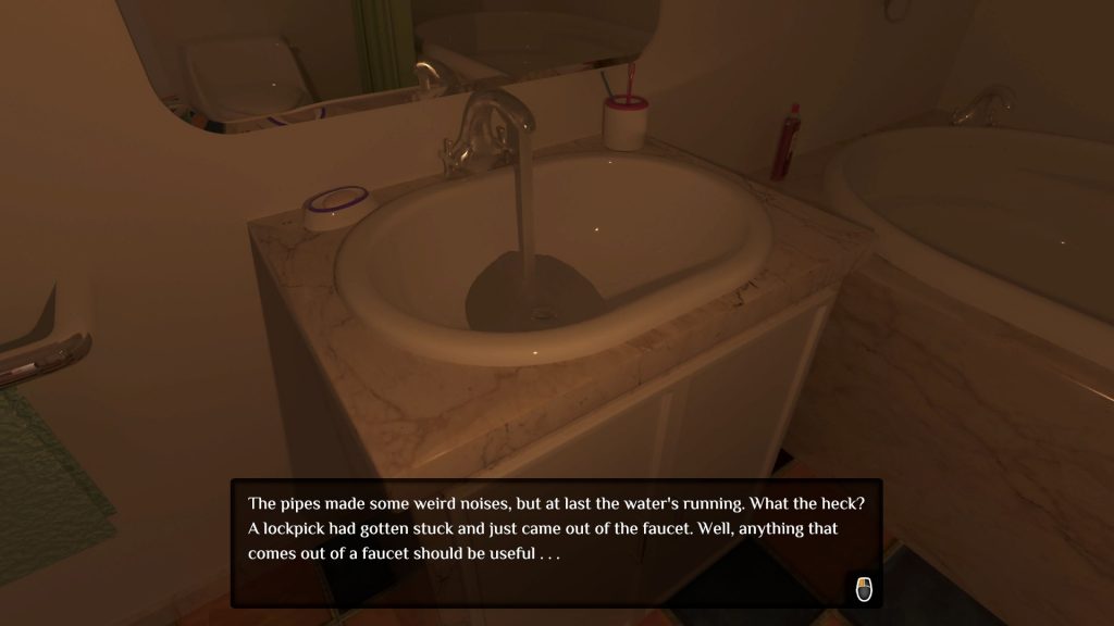 In traditional point-and-click adventure fashion, I was left to click my way out of the bedroom in search for clues as to what to do next. I found myself in dire need of some direction at first though, since I didn’t have a clue if there was an inventory, how to get to it, and at some point how to combine items in it, should that be a possibility.