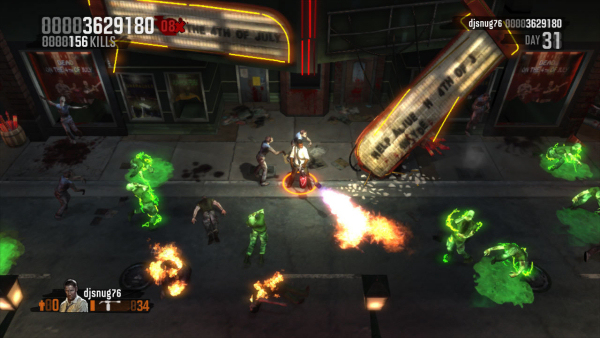 The controls are intuitive and accessible to any skill level of player. Moving the right stick controls weapons fire, with your default gun being equipped with unlimited ammo, while both triggers control the chainsaw. RT is the basic chainsaw attack, capable of slicing through a large grouping of enemies at once, while LT allows you to go at each zombie individually, execution style, and gives your score multiplication counter a boost with each kill.
